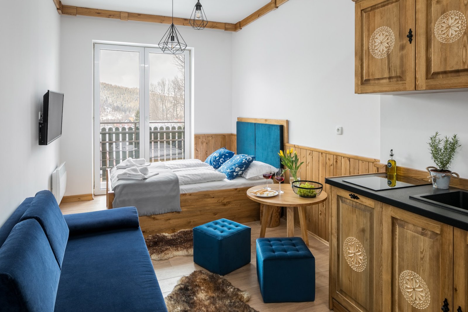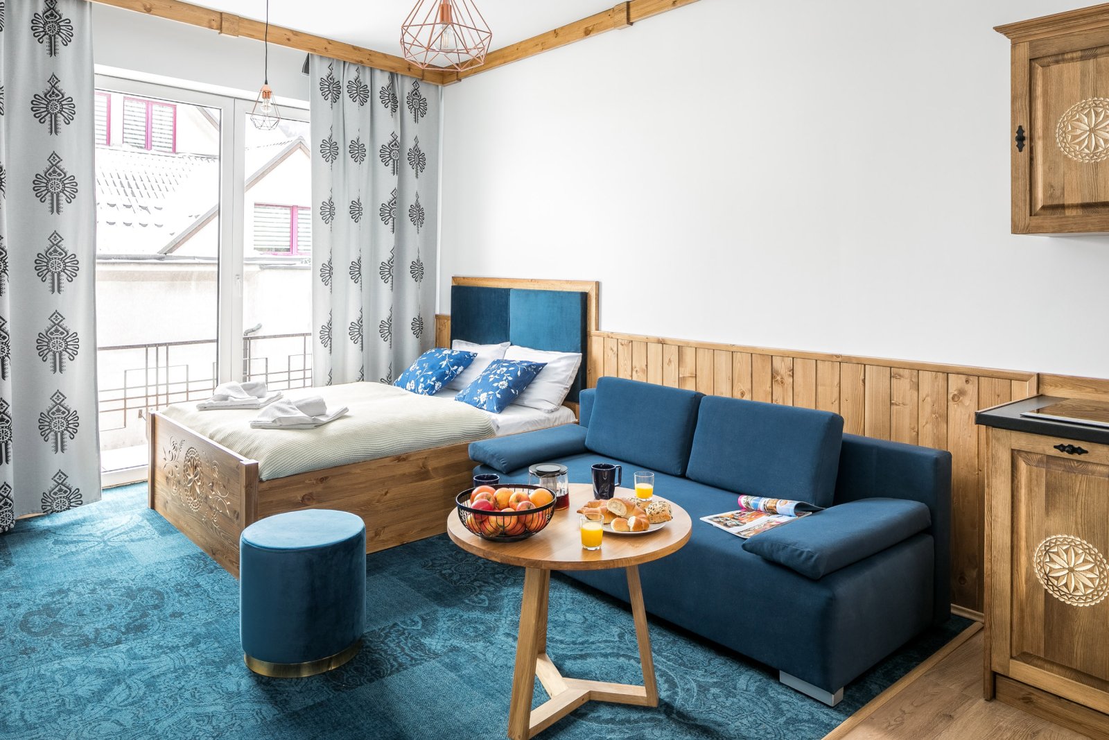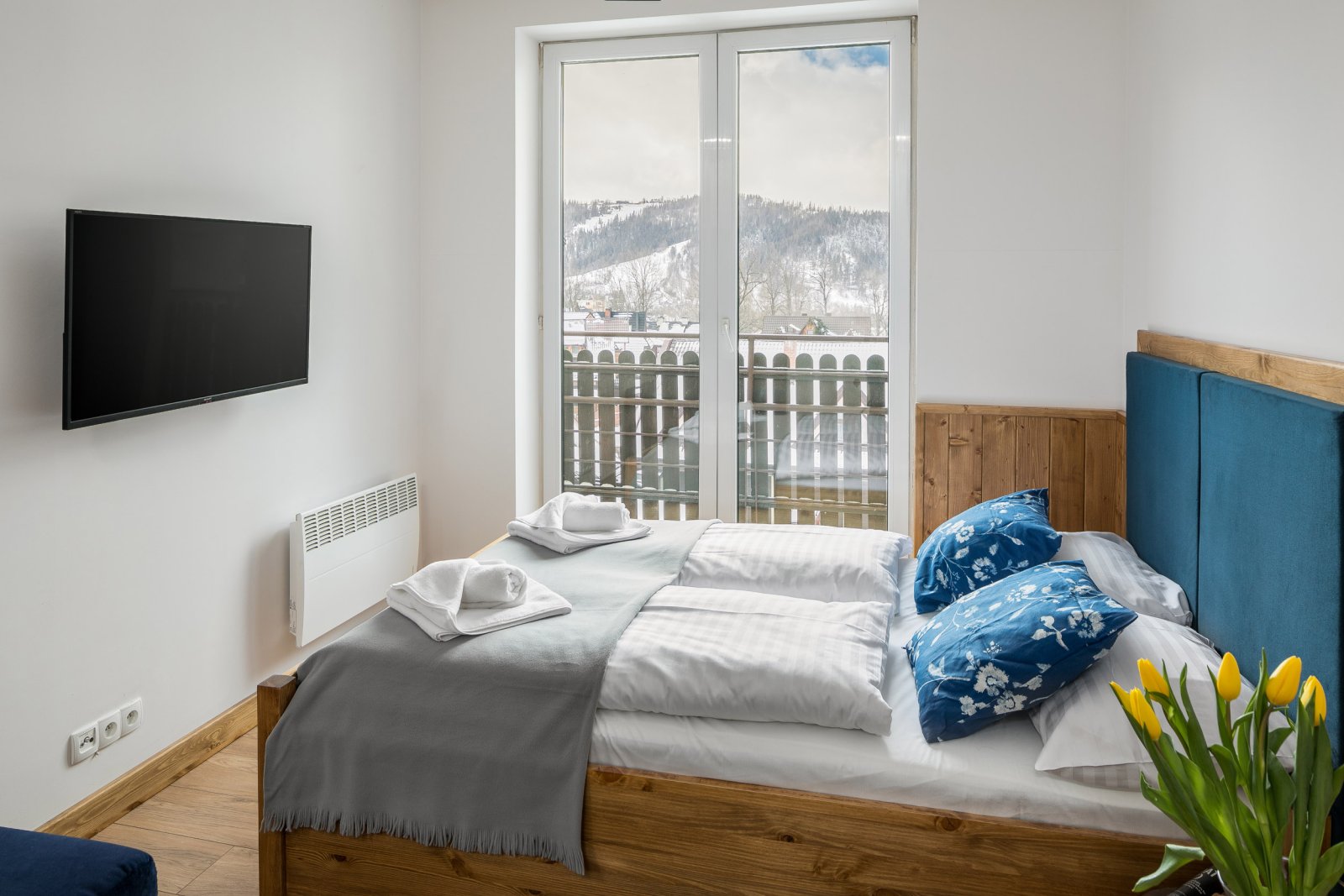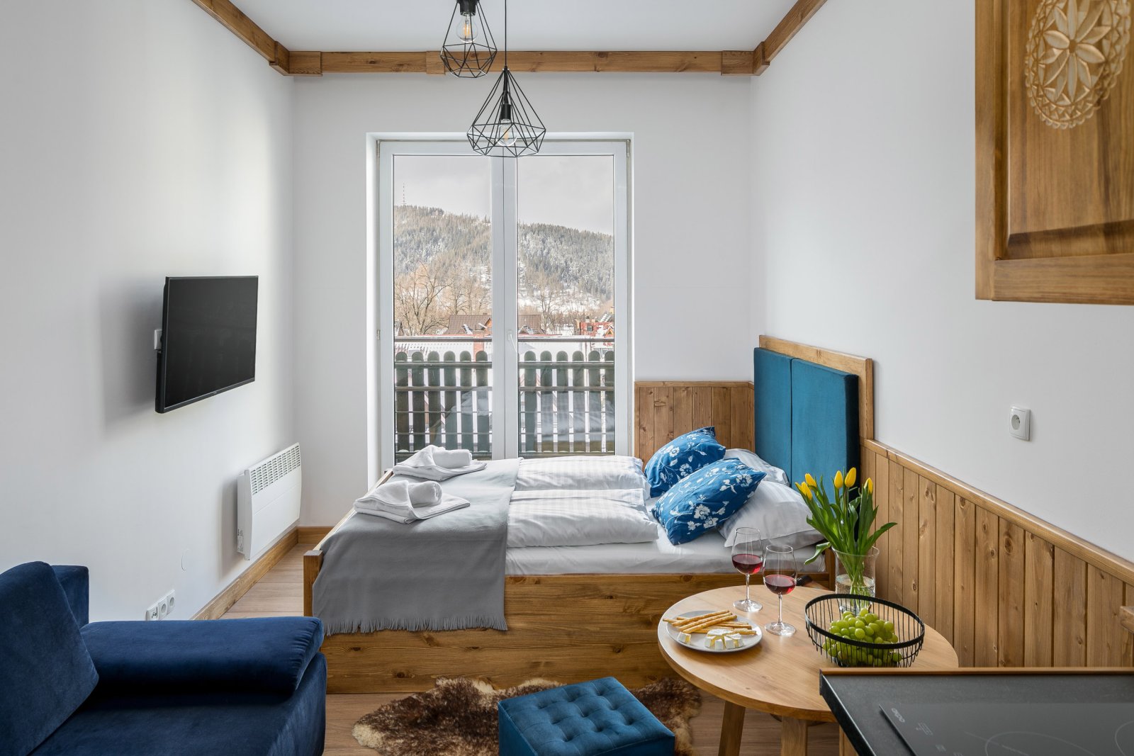 Apartament ten dysponuje oddzielnym wejściem, obejmuje 1 sypialnię - część wypoczynkową oraz 1 łazienkę z prysznicem i suszarką do włosów. Goście mogą przygotowywać posiłki w aneksie kuchennym wyposażonym w płytę kuchenną, lodówkę, toster, ekspres do kawy, zmywarkę do naczyń i przybory kuchenne. Apartament ten dysponuje jadalnią oraz telewizorem z płaskim ekranem i dostępem do kanałów kablowych. Dostępny jest również balkon z widokiem na miasto oraz na zbocza Gubałówki. W apartamencie znajduje się 1 łóżko oraz rozkładana sofa. Apartament - 4 osobowy. Powierzchnia pokoju ok.: 30 mkw.