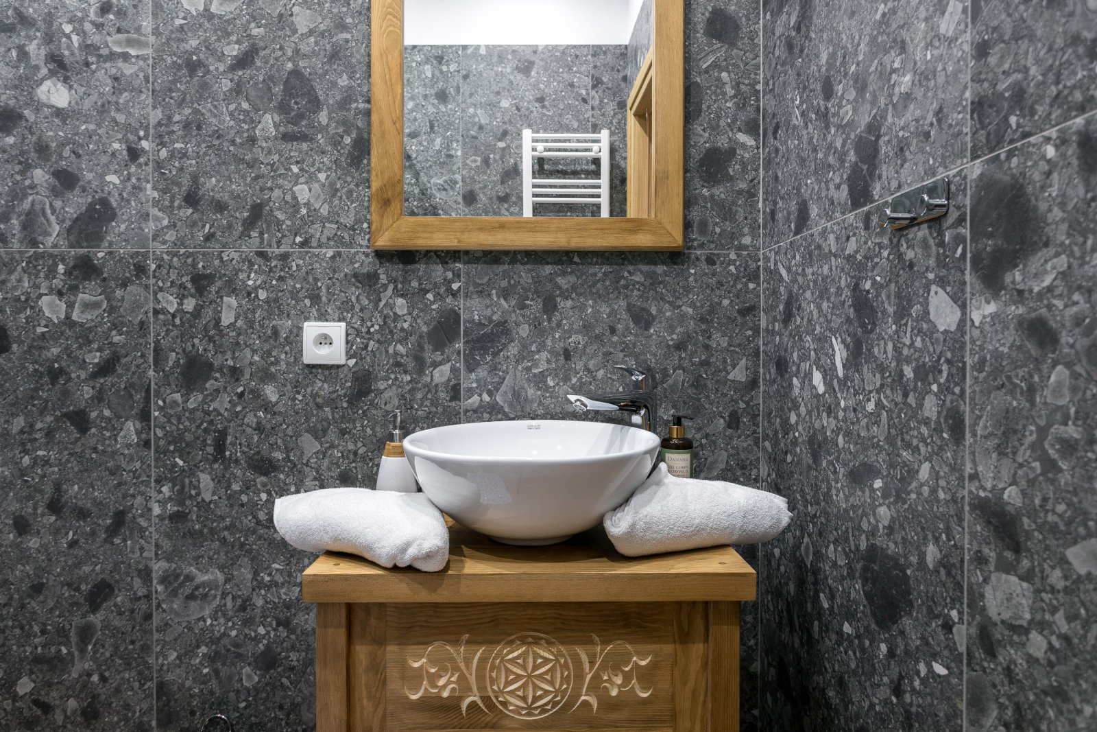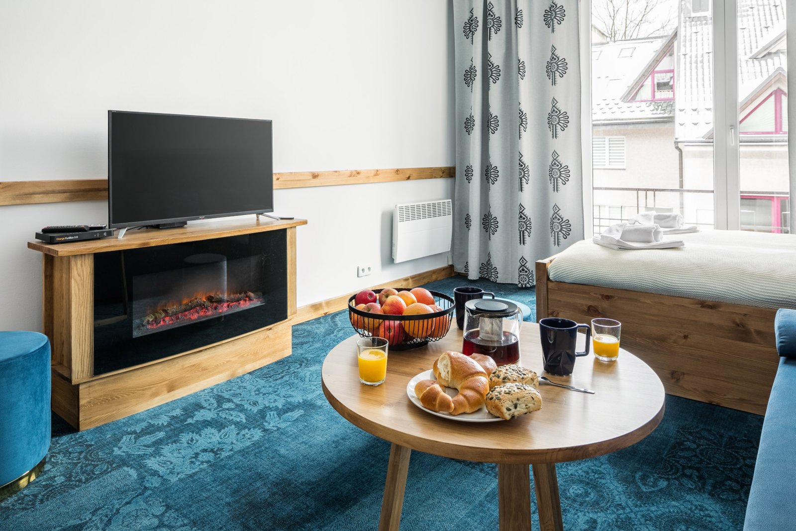 Apartament dysponuje oddzielnym wejściem, salonem, oddzielną sypialnią oraz łazienką z prysznicem i suszarką do włosów. W aneksie kuchennym dostępna jest płyta kuchenna, lodówka, zmywarka, toster, ekspres do kawy i przybory kuchenne. Apartament dysponuje częścią wypoczynkową oraz telewizorem z płaskim ekranem i dostępem do kanałów kablowych. Apartament ten wyposażony jest w kominek Dostępny jest również balkon z widokiem na góry oraz miasto. Obiekt posiada 2 podwójne łóżka oraz rozkładaną sofę . Apartament - 6 osobowy. Powierzchnia apartamentu ok.: 45 mkw.