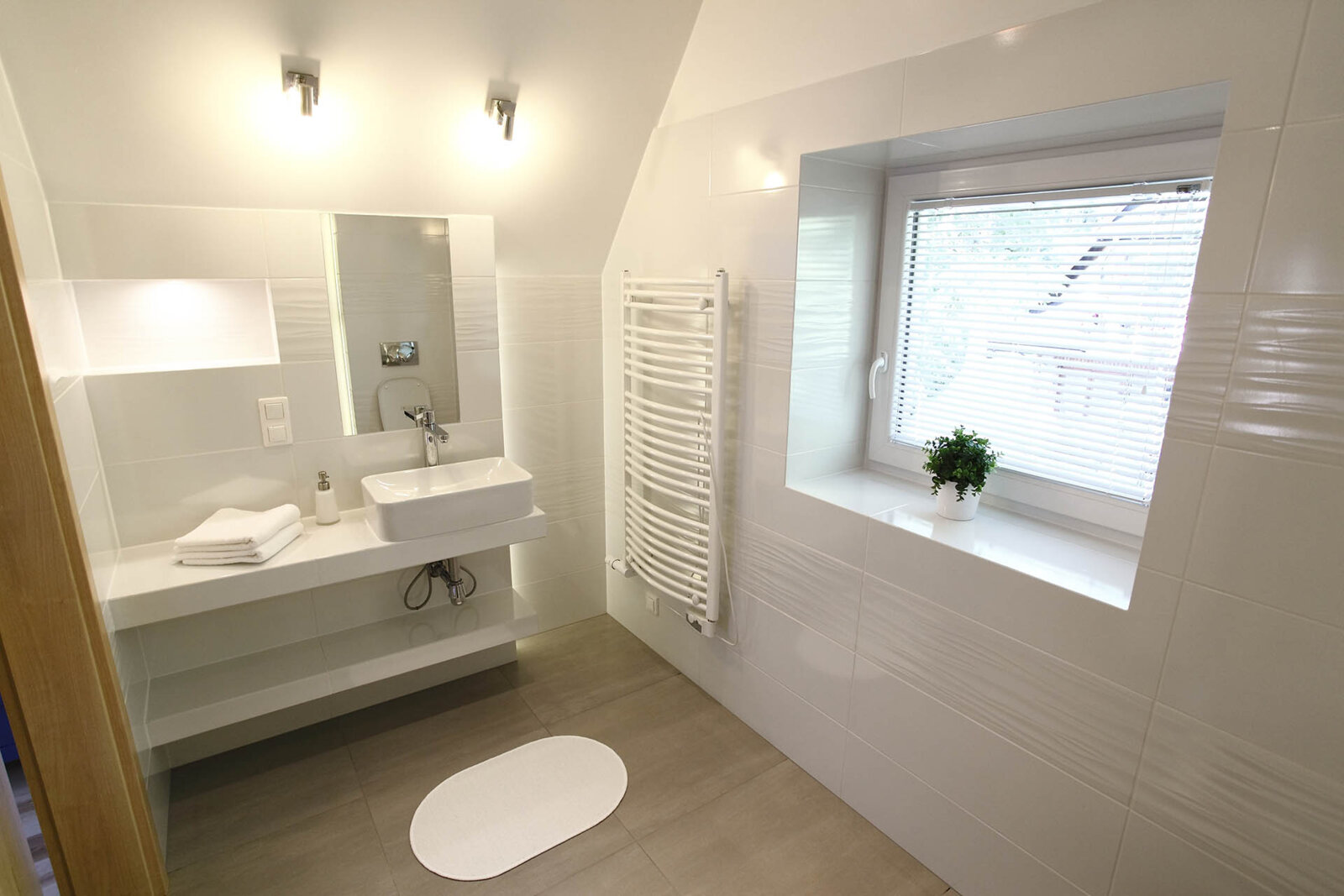 - Parter: w pełni wyposażona kuchnia z jadalnią, salon (TV SAT), sypialnia z podwójnym łóżkiem oraz duża przestronna łazienka z prysznicem (deszczownica);