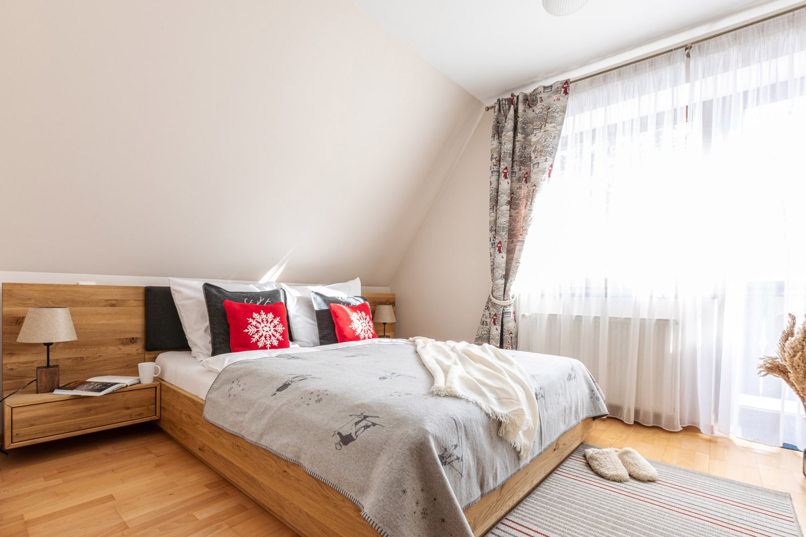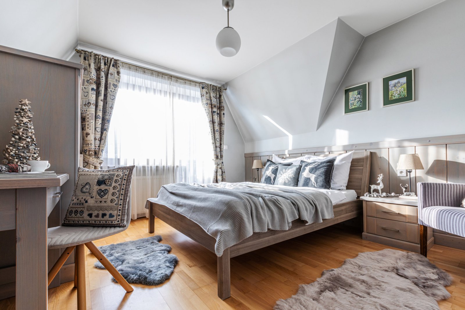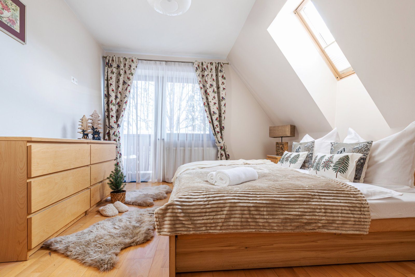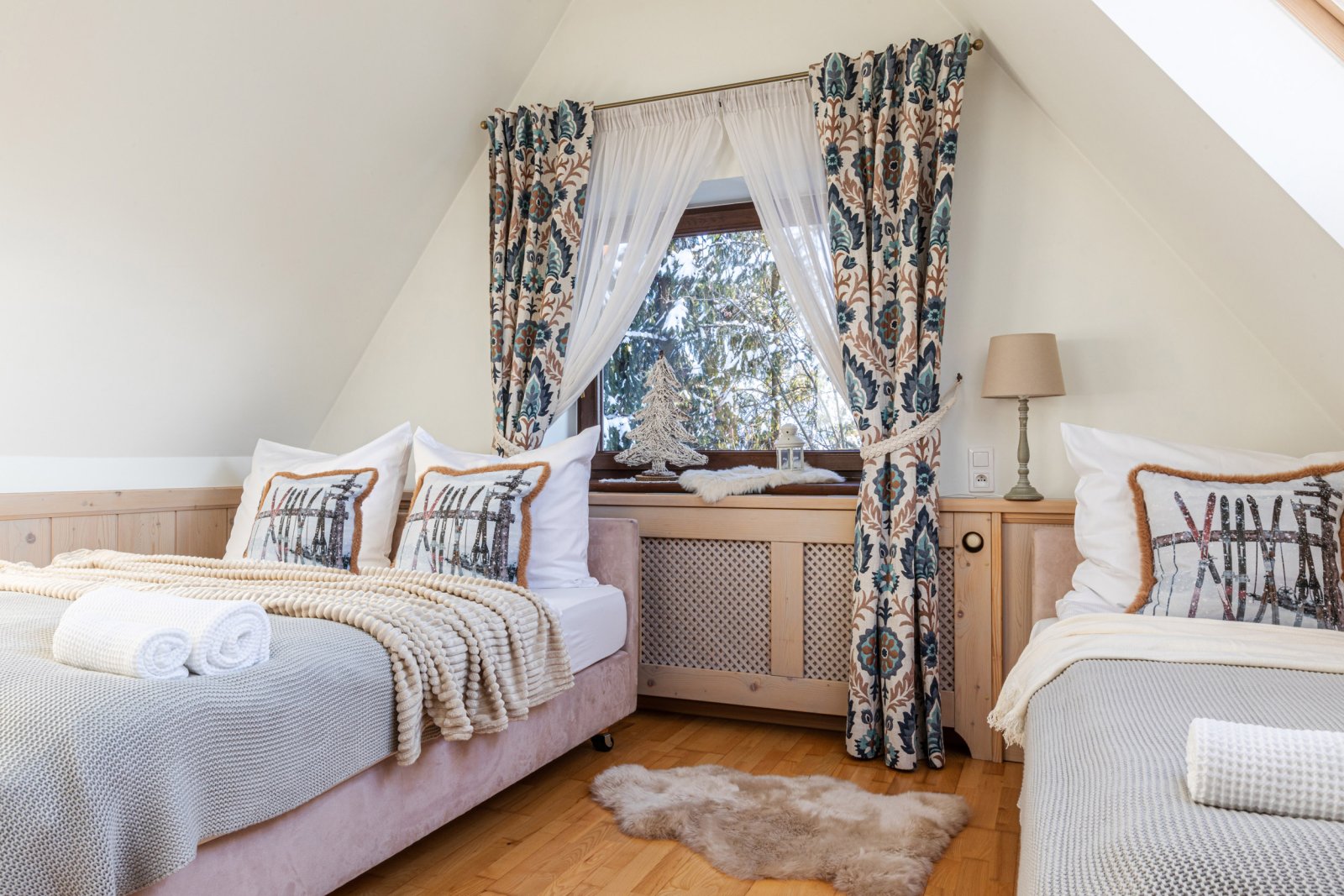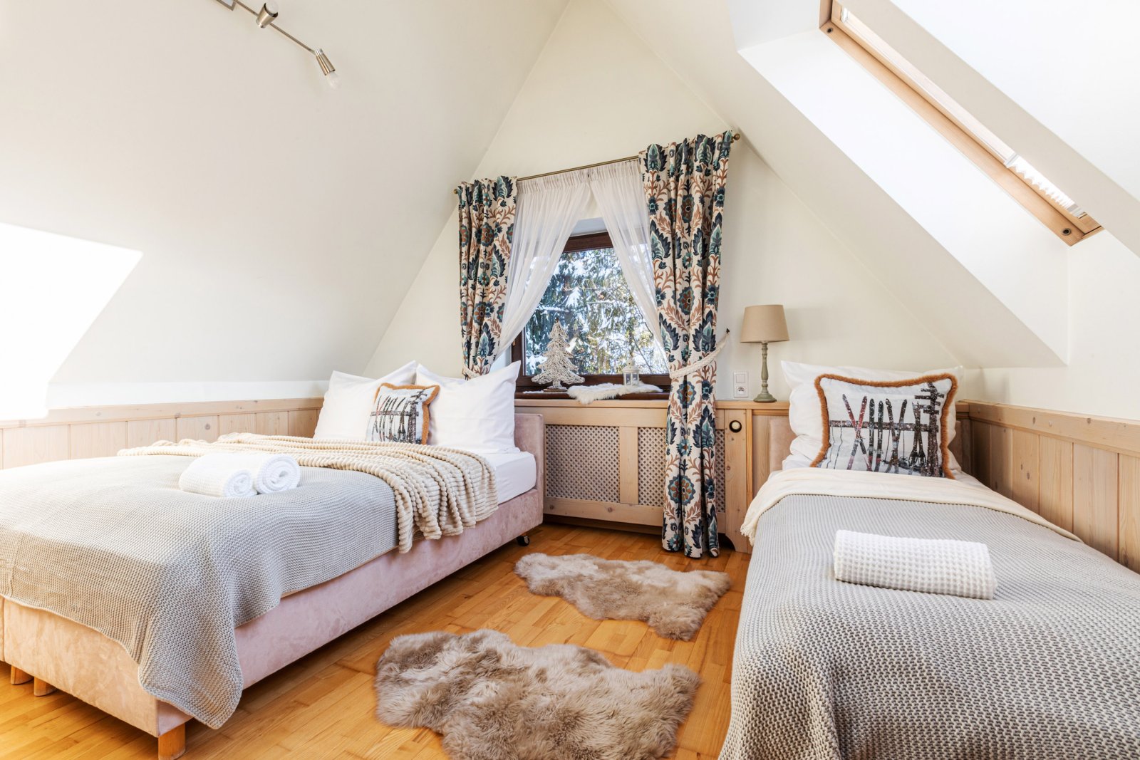 - Sypialnie: pięć sypialni (cztery dwuosobowe i jedna trzyosobowa, trzy z balkonami z widokiem na Tatry);