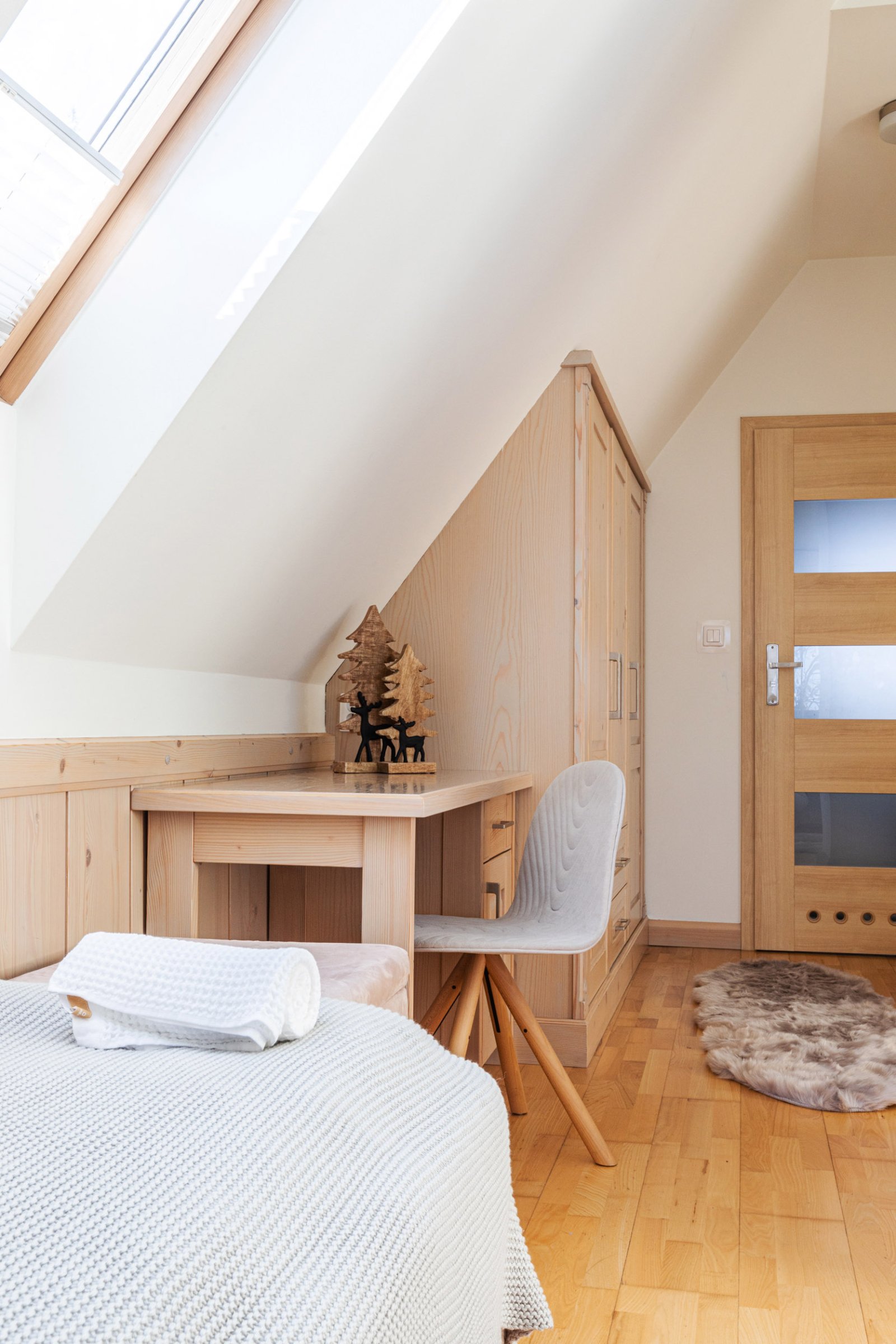 - Piętro: trzy sypialnie (dwie dwuosobowe i jedna trzyosobowa) z balkonami z widokiem na Tatry oraz 2 łazienki z prysznicem;